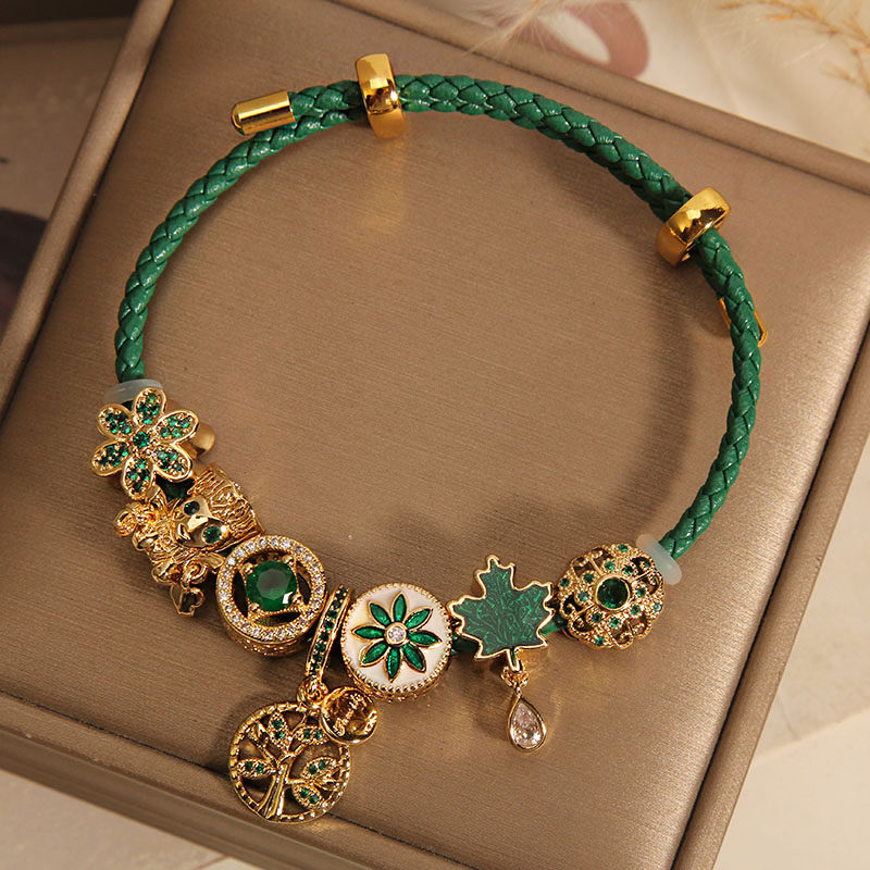 Material: woven rope (green)+alloy (gold-plated process)+artificial decorative stone (green/transparent)