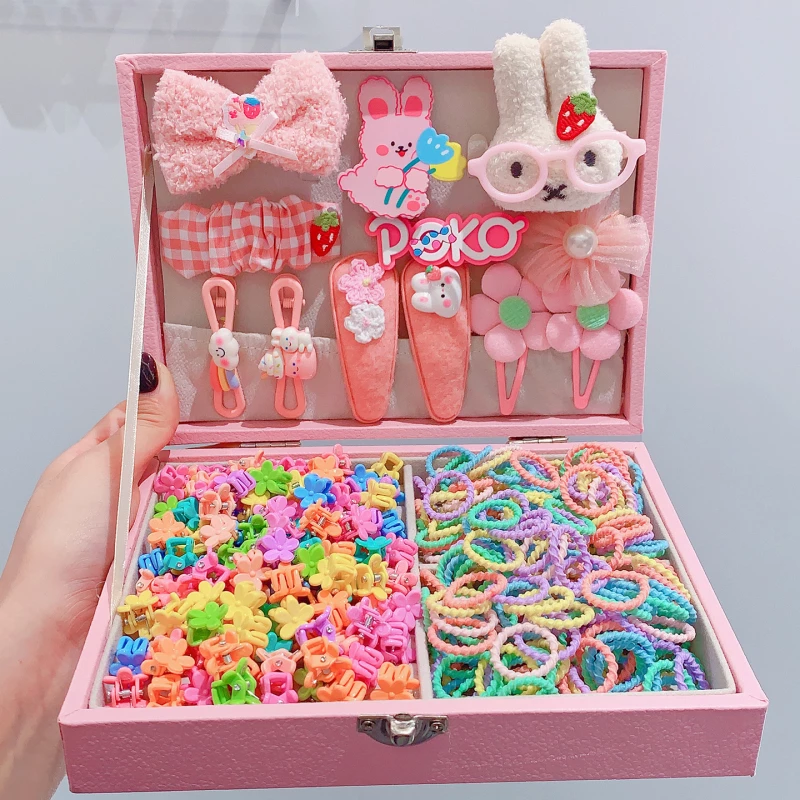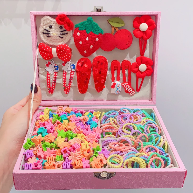 This adorable Hello Kitty-themed accessory set comes in a pink storage box and includes a variety of hair clips, elastic hair ties, and decorative bows, all in a vibrant, child-friendly pink palette. It also features a large collection of colorful mini hair ties for daily styling.