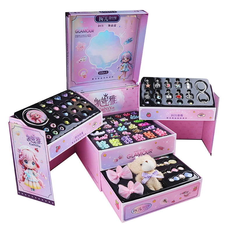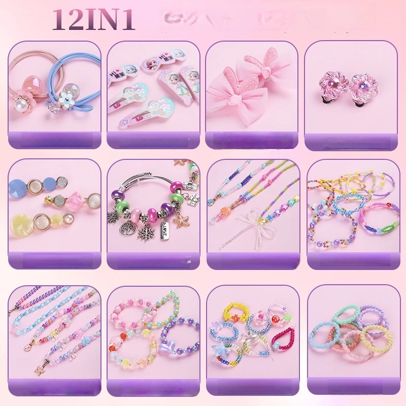 This comprehensive DIY jewelry kit includes a variety of decorative components: artificial beads (pastel-colored, glitter-style), alloy charms, and a multi-compartment storage case, allowing children to create custom necklaces, bracelets, and more.