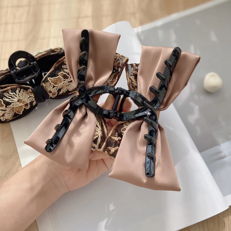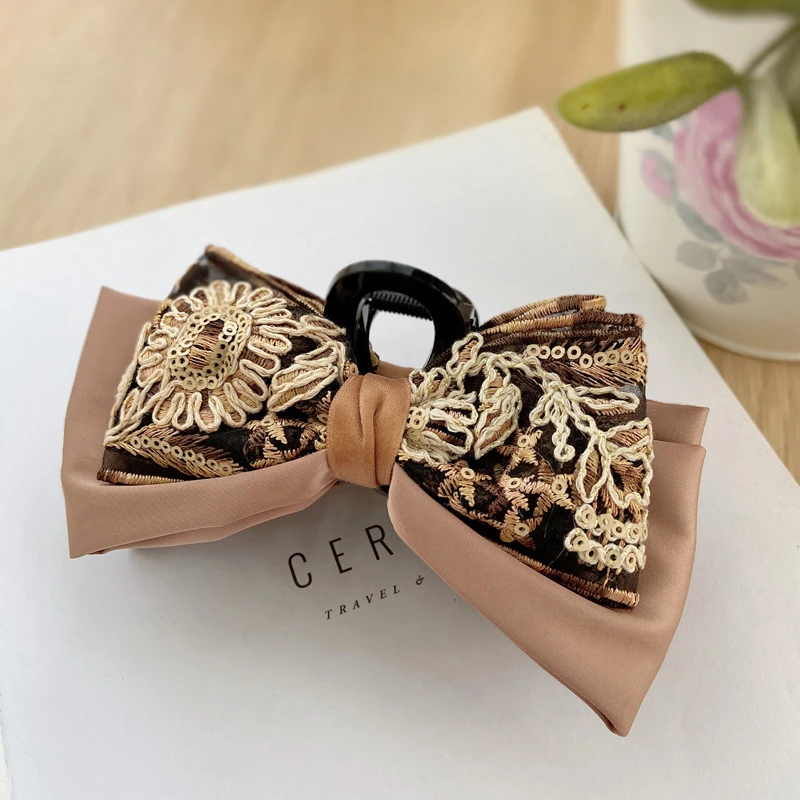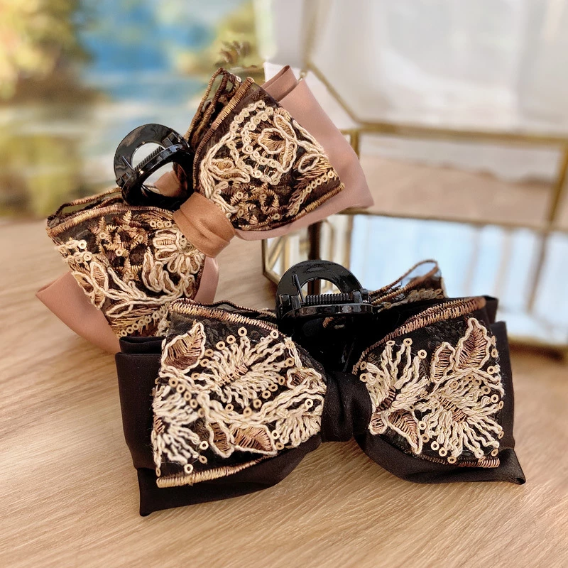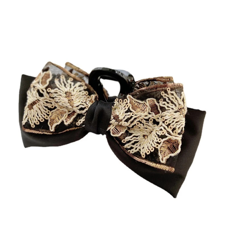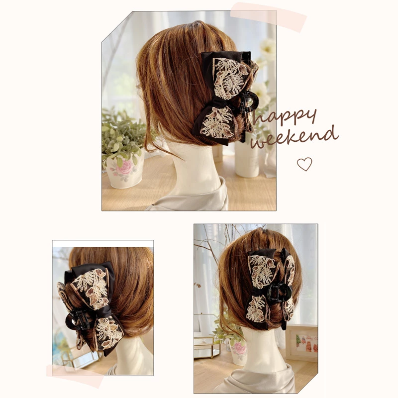 This is a women's fashion hair claw clip, designed for daily wear and casual styling. It features a multi-layered bow made of solid fabric and embroidered lace, with a black alloy claw base for a secure hold. The clip is intended as a decorative hair accessory to hold hair in place and add a stylish touch to an outfit.