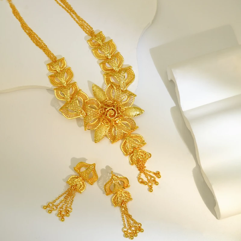 This elegant 2-piece jewelry set (necklace + earrings) is crafted from alloy with a polished gold-toned finish, featuring intricate lace-floral cutout detailing and tassel accents (no natural gemstones or precious metals are used). The statement necklace showcases a layered floral centerpiece paired with cascading lace-patterned links, while the matching earrings echo the design with delicate tassels for a cohesive, sophisticated look.