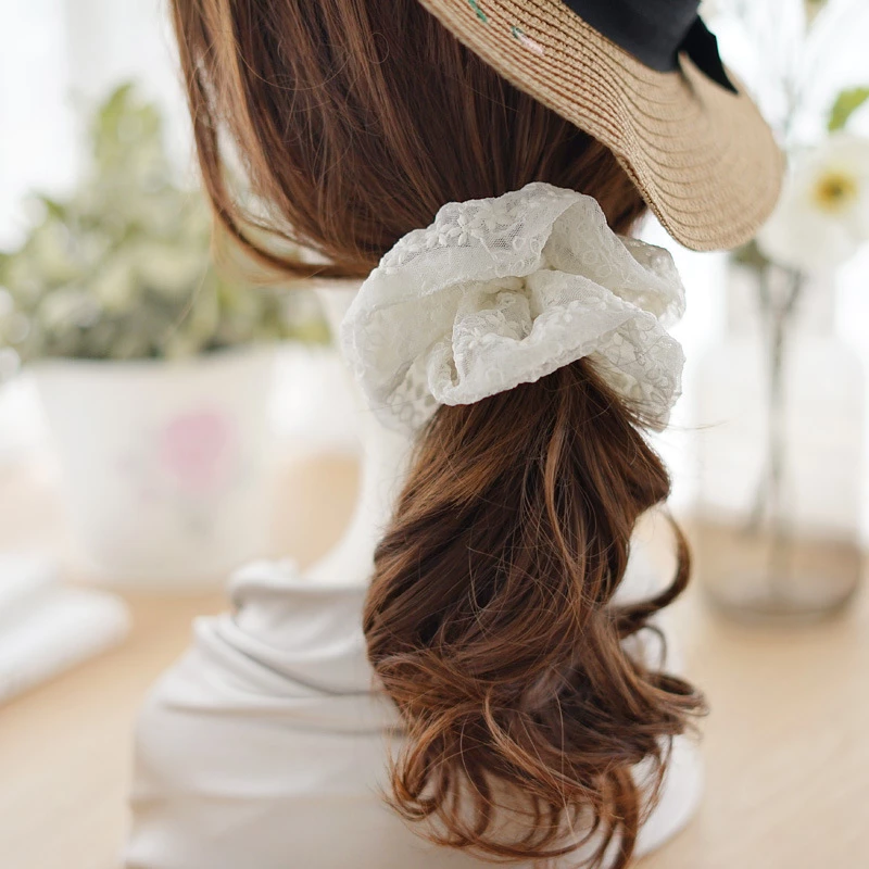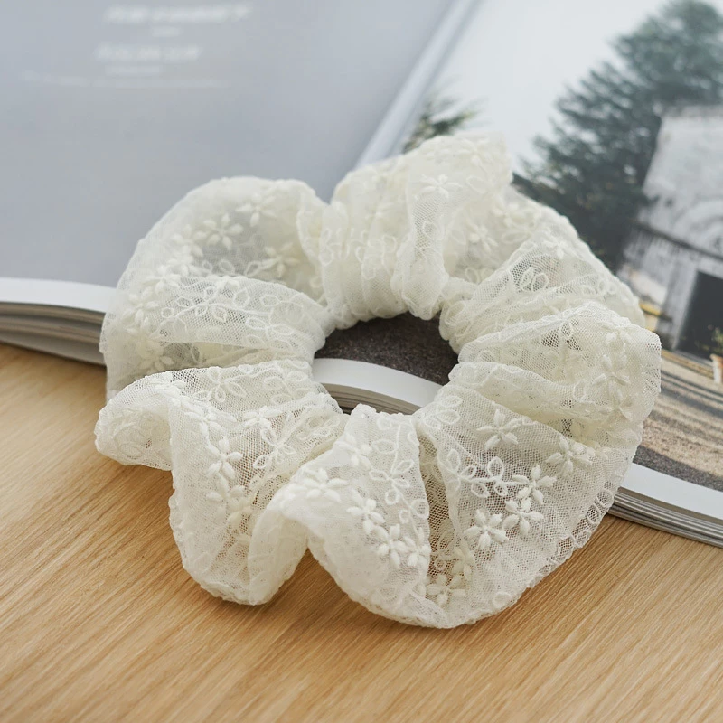 This is a fashion hair accessory. It features a wide, delicate lace scrunchie with an intricate floral pattern. The stretchable elastic core provides a gentle yet secure hold for ponytails, buns, or half-up hairstyles, adding a soft, romantic touch to any look.