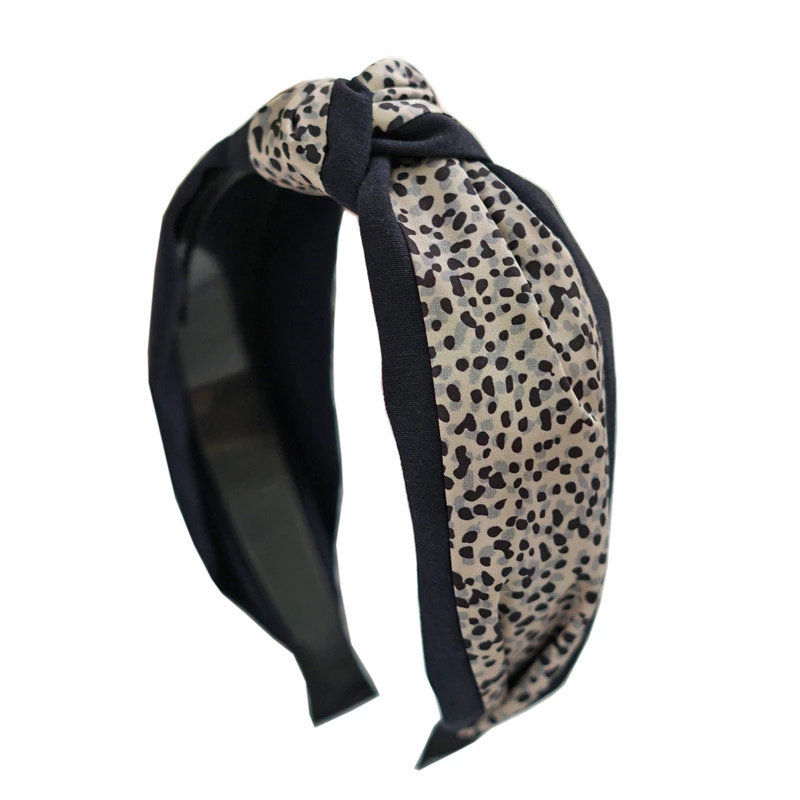 This is a fashion hair accessory. It features a wide, padded plastic headband base combining a soft, muted leopard-print fabric in tones of blue and black with a contrasting solid cream fabric, finished with a knotted detail at the top. The inner side has a non-slip grip to keep it securely in place, and the chic mix of patterns creates a stylish, modern look that elevates any hairstyle.