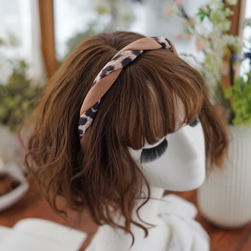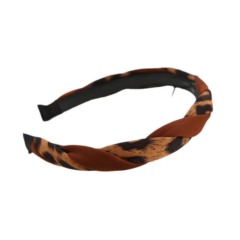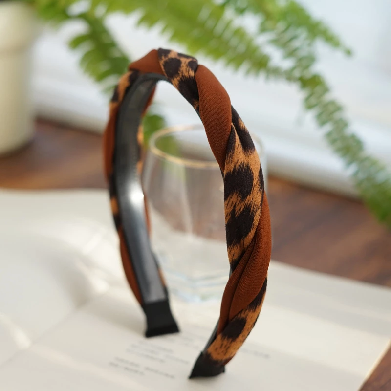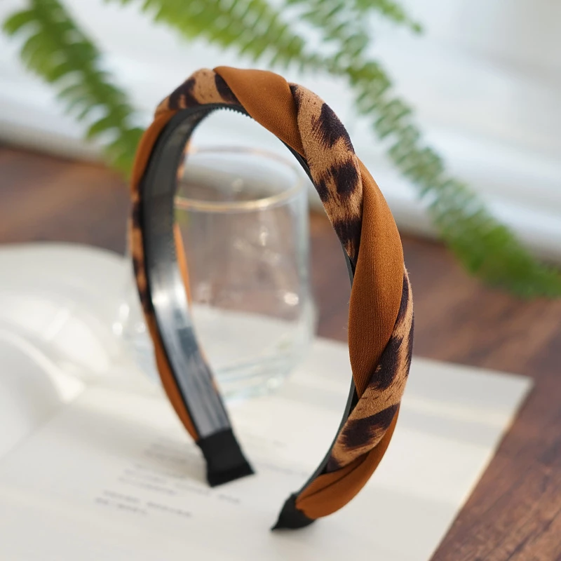 This is a women's fashion headband, designed for daily wear and casual styling. It features a slim, twisted fabric base that blends classic leopard print with solid earthy tones, mounted on a black fabric underband for a secure, comfortable fit. The headband is intended as a decorative hair accessory to hold hair in place and add a stylish, edgy touch to an outfit.
