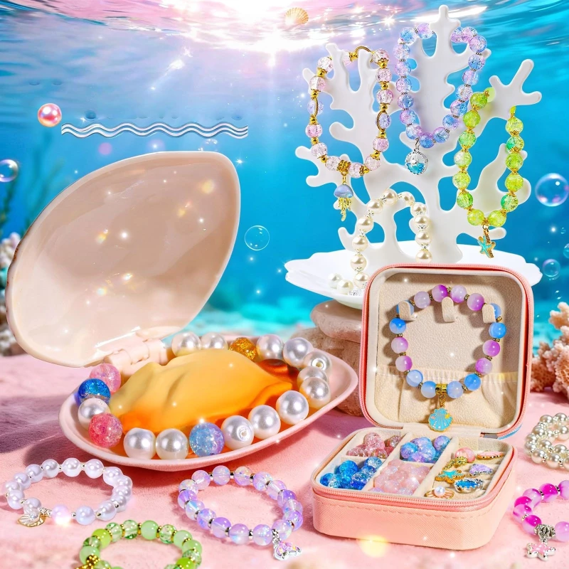 This kids' jewelry set features mermaid-inspired designs, including multiple beaded necklaces/bracelets (in pastel glitter tones and artificial pearl styles) and a decorative storage case.