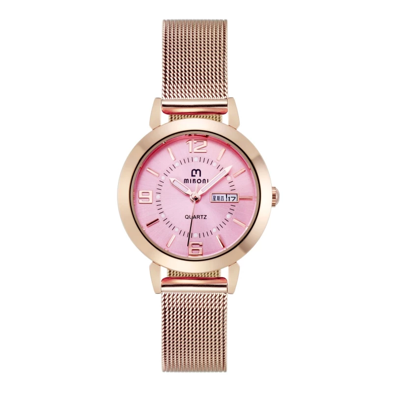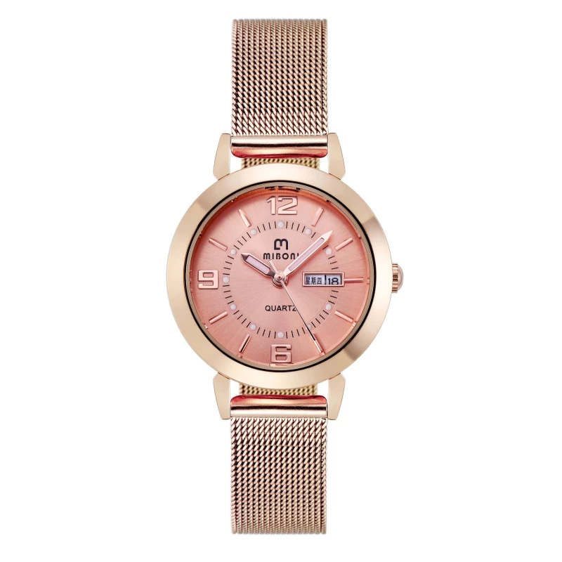 This is a fashion watch designed for women, featuring a polished rose gold-toned alloy case and a matching mesh strap. The rose gold dial has subtle crystal accents, clear numeral hour markers, and a day-date display at the 3 o’clock position, creating a refined, feminine aesthetic that pairs beautifully with casual everyday wear and special occasions.