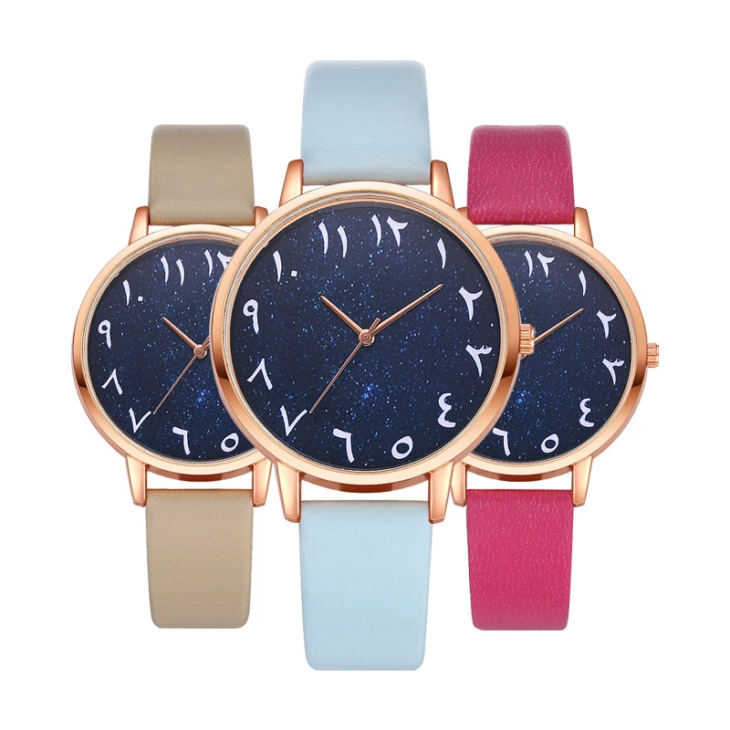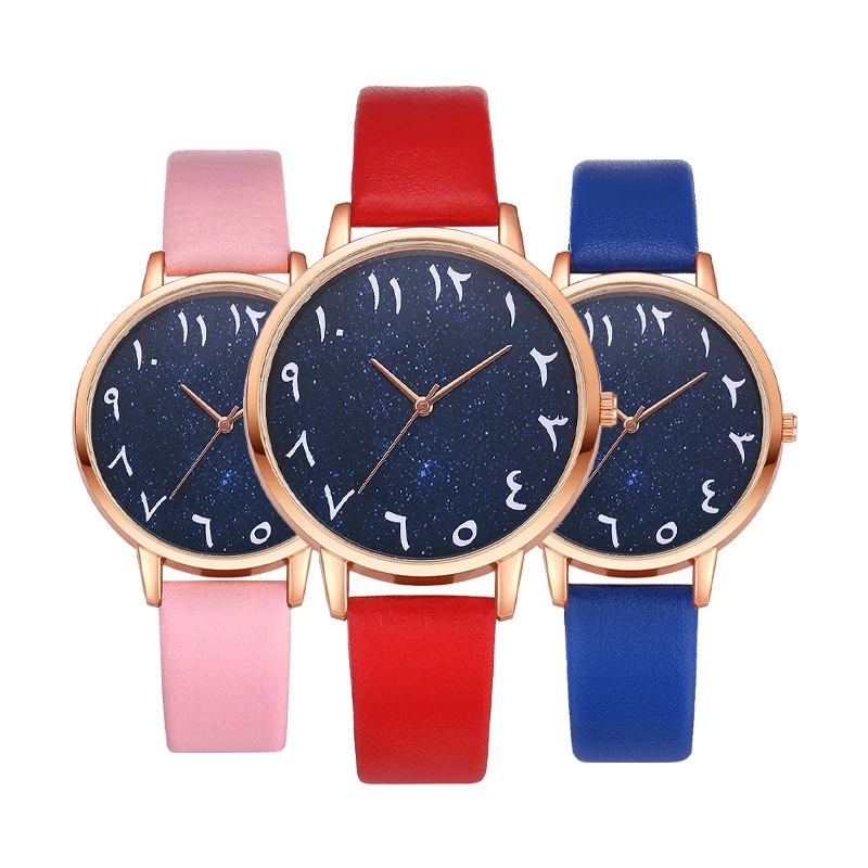 This is a collection of fashion watches designed for women, featuring a rose gold-toned alloy case and a choice of pastel faux leather straps (light blue or pink). The deep blue dial has a glittering starry finish with delicate Arabic numerals, creating a romantic, whimsical aesthetic that pairs beautifully with casual everyday wear and special occasions.