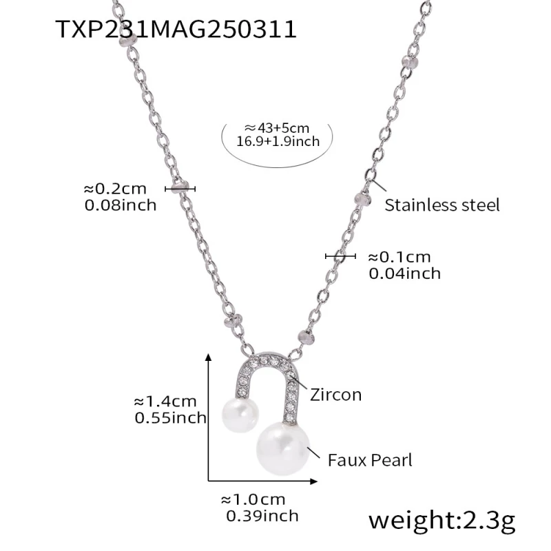 This elegant matching set is crafted from durable silver-tone alloy, featuring a fine, textured chain necklace and coordinating drop earrings. The necklace showcases a curved pendant inlaid with tiny cubic zirconia, finished with two lustrous faux pearls of varying sizes for a modern, asymmetrical look. The earrings mirror this design, with a curved cubic zirconia-accented stud and dual faux pearl drops.