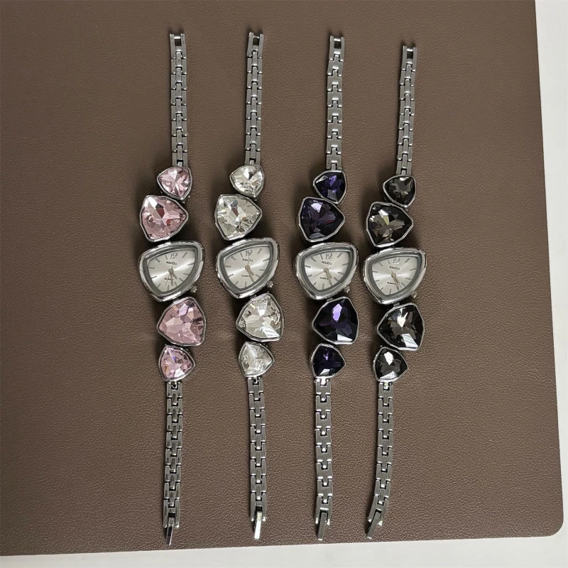 This is a fashion wristwatch featuring an irregular analog dial with slim hour markers, a polished silver-tone alloy case, and a bracelet-style strap embedded with large, dark, irregular-cut crystal accents. It is powered by a quartz movement, designed for everyday casual wear, and provides a clear, easy-to-read time display. The watch has a decorative, modern aesthetic suitable for daily use and general occasions.