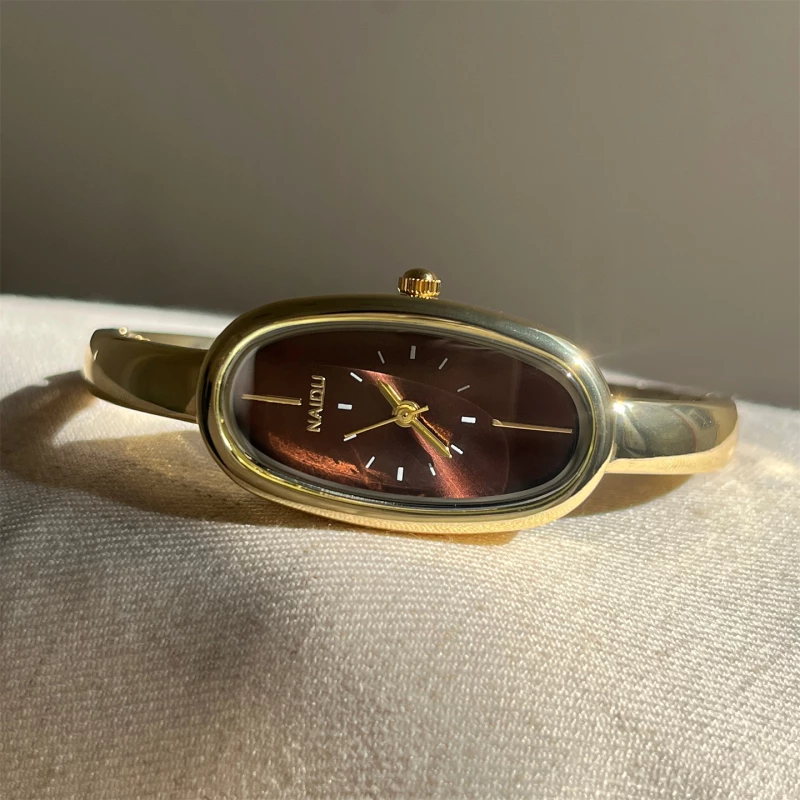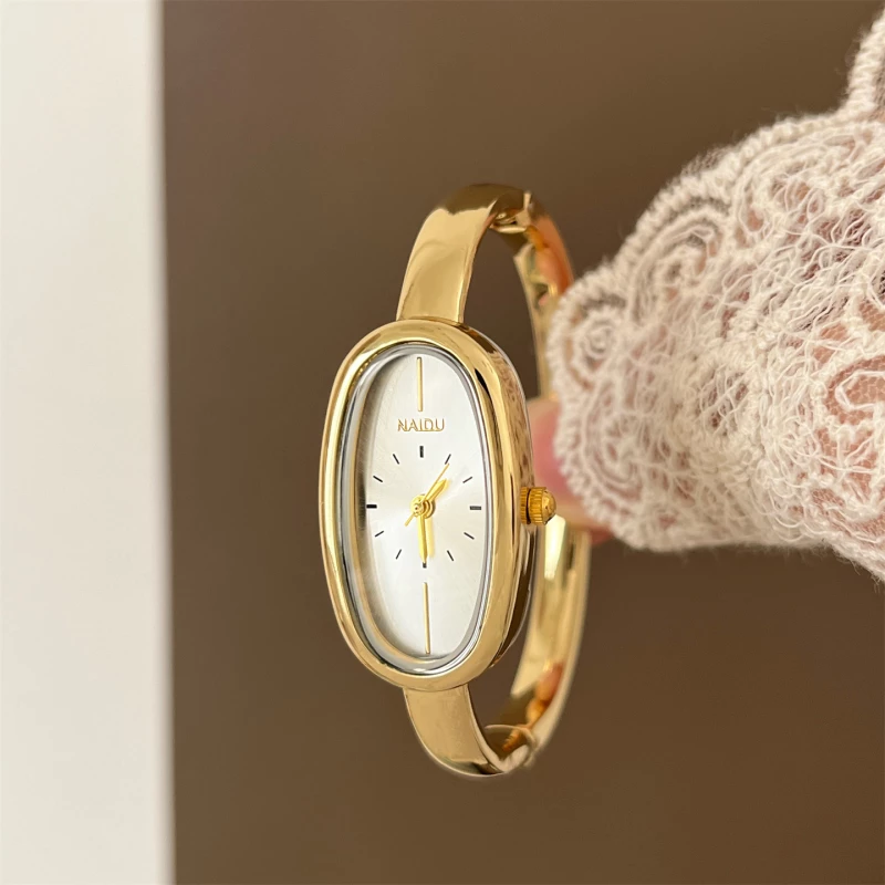 This is a fashion wristwatch featuring an elongated oval analog dial with a sunray finish and minimalist markers, a polished silver-tone alloy case, and a sleek, open cuff-style alloy strap. It is powered by a quartz movement, designed for everyday casual wear, and provides a clear, easy-to-read time display. The watch has a modern, minimalist aesthetic suitable for daily use and general occasions.