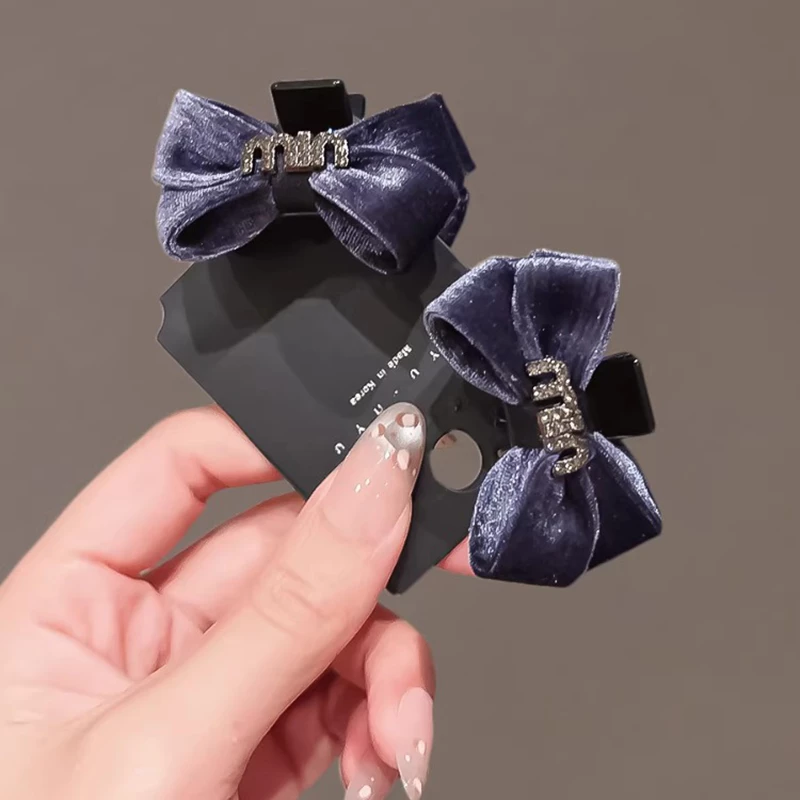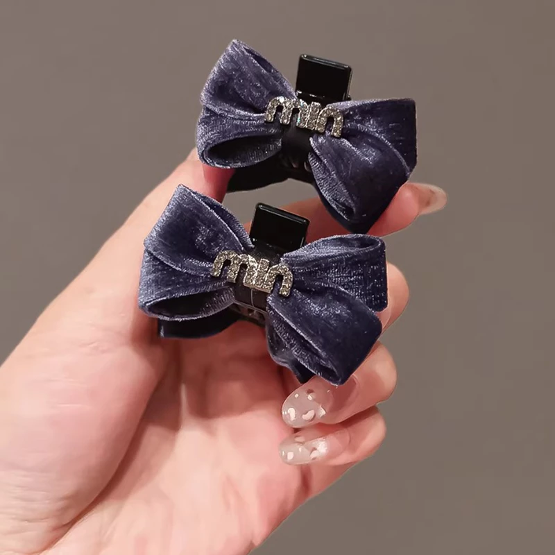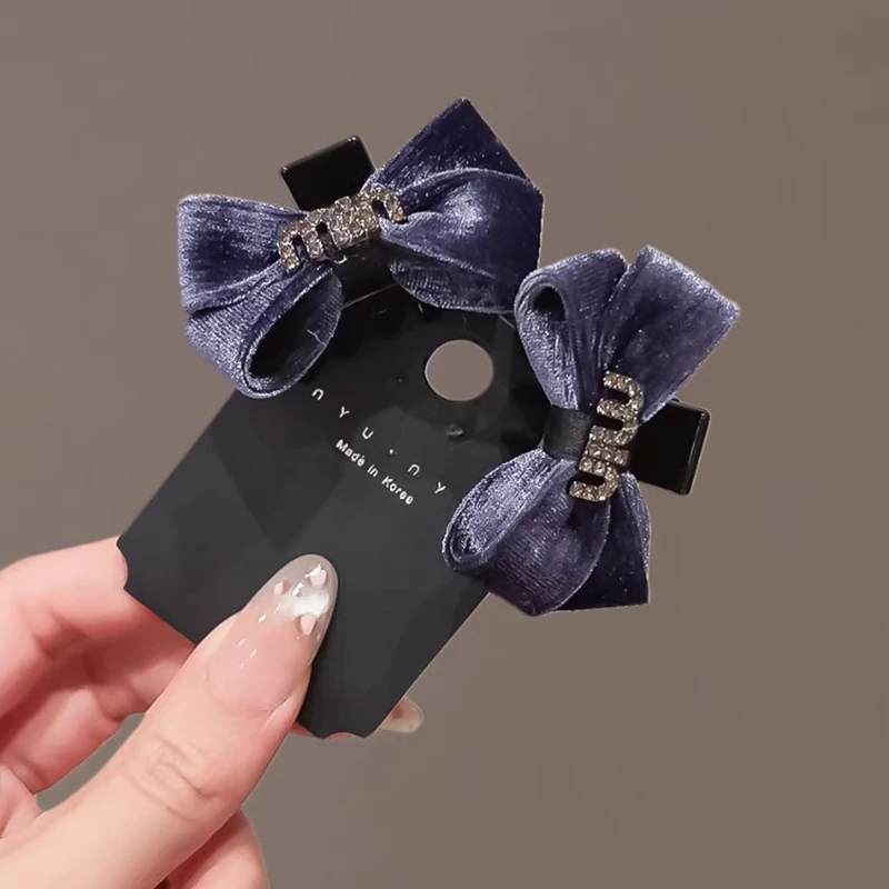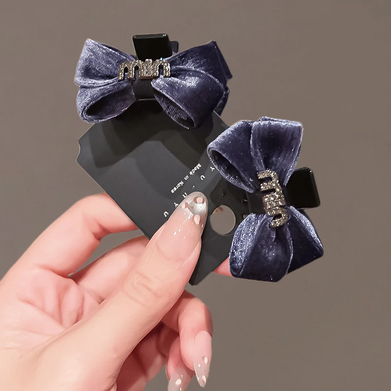 This set of 2 hair clips features a lush navy velvet bow design, each accented with a sparkling artificial crystal embellishment (one with a "mimi" letter detail, the other with a geometric detail) for a delicate, elegant touch. The clips are made of durable black alloy, securely holding thin to medium hair while the soft velvet material ensures comfortable all-day wear. Ideal for elevating daily hairstyles, casual outings, or adding a refined charm to special occasions, these fashion hair accessories blend cozy texture with on-trend style.