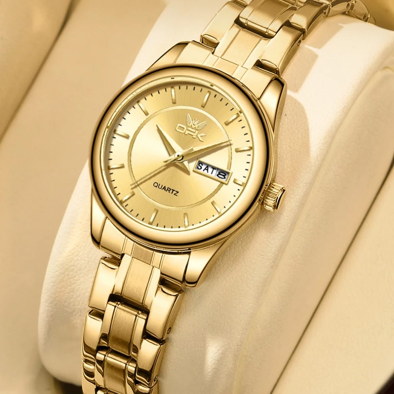 This is a fashion quartz watch designed for daily wear. It features a sleek round gold-toned alloy case, paired with a polished link-style gold-toned alloy strap for a unified, elegant look. The gold dial has a subtle sunray finish, complemented by minimalist bar hour markers, and includes a convenient day/date display window at the 3 o'clock position. Its refined, understated aesthetic makes it suitable for casual daily use and light social occasions.