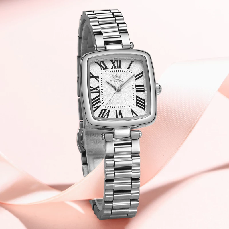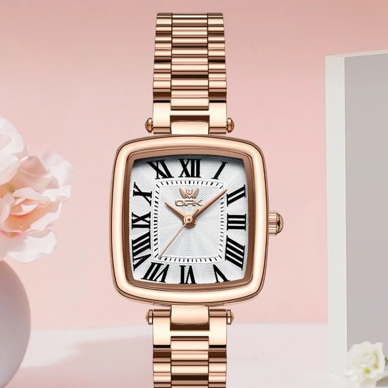 This is a fashion quartz watch designed for daily wear. It features a rectangular rose gold-toned alloy case, paired with a matching link-style alloy strap. The white dial has a subtle radial wave texture, framed by bold Roman numeral hour markers and complemented by rose gold-toned hands. Its elegant, timeless design makes it suitable for casual daily use and light social occasions.