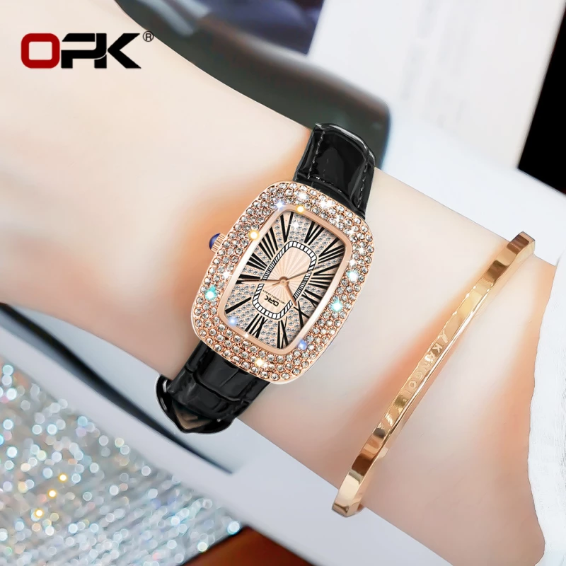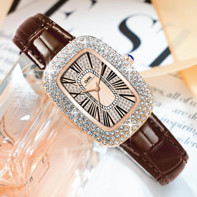 This is a fashion quartz watch designed for daily wear. It features a bold, cushion-shaped rose gold-toned alloy case, encrusted with a double row of sparkling stones along the bezel for a glamorous look. The watch is paired with a smooth brown leather strap with a subtle crocodile-embossed texture. The dial has a striking sunray design at its center, surrounded by a radiating pattern of black lines and stone hour markers, with the OPK logo prominently displayed, creating a luxurious and eye-catching aesthetic ideal for special occasions and nights out.