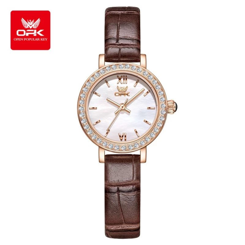 This is a fashion quartz watch designed for daily wear. It features a round rose gold-toned alloy case, surrounded by a bezel encrusted with decorative crystals, and paired with a matching link-style alloy strap. The white dial has a subtle mother-of-pearl finish, accented with Roman numerals at 12 and 6 o'clock, slim bar hour markers, and rose gold-toned hands. Its elegant, understated design makes it suitable for casual daily use and light social occasions.