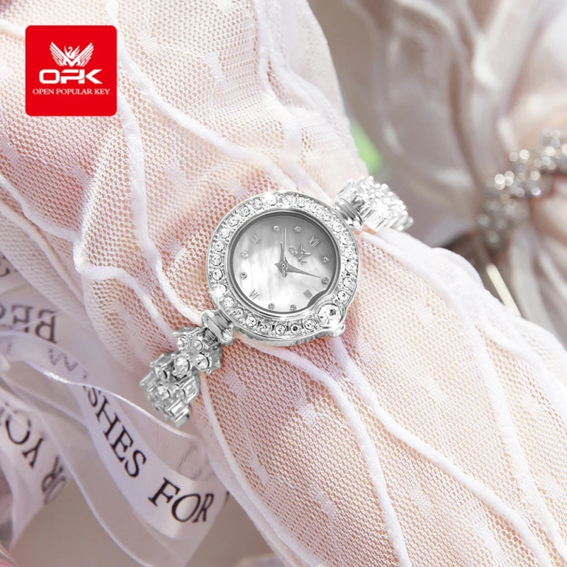 This is a fashion quartz watch designed for daily wear and special occasions. It features a delicate, round rose gold-toned alloy case encrusted with a double row of sparkling stones along the bezel, paired with an intricately designed, crystal-embellished bracelet strap that offers a luxurious, jewelry-like appearance. The elegant pink dial has a subtle mother-of-pearl effect, accented by minimalist Roman numeral hour markers, sparkling stone indices, and the OPK logo, creating a glamorous and feminine aesthetic ideal for adding a touch of sparkle to any outfit.