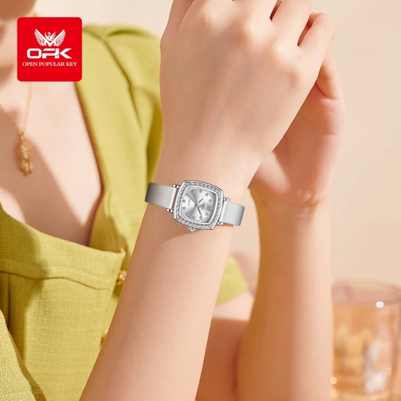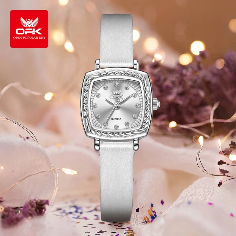This is a fashion quartz watch designed for daily wear. It features a distinctive square-shaped silver-toned alloy case, framed by a unique twisted rope-patterned bezel for a touch of texture and elegance. The watch is paired with a smooth brown leather strap with a subtle embossed finish. The silver dial is adorned with sparkling stone hour markers and the OPK logo at the center, creating a delicate and feminine aesthetic that is perfect for casual daily use and special occasions.