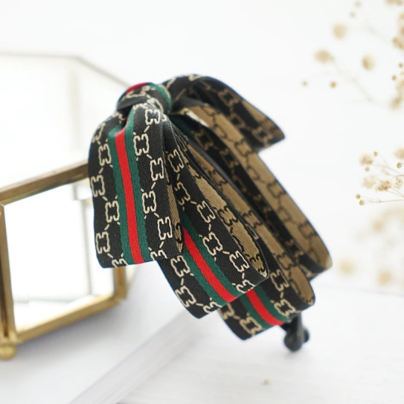 This is a women's fashion headband, designed for daily wear and casual styling. It features a patterned fabric bow with long, flowing tails, combining a classic monogram print with a striped accent band. The headband is intended as a decorative hair accessory to hold hair in place and add a stylish, polished touch to an outfit.