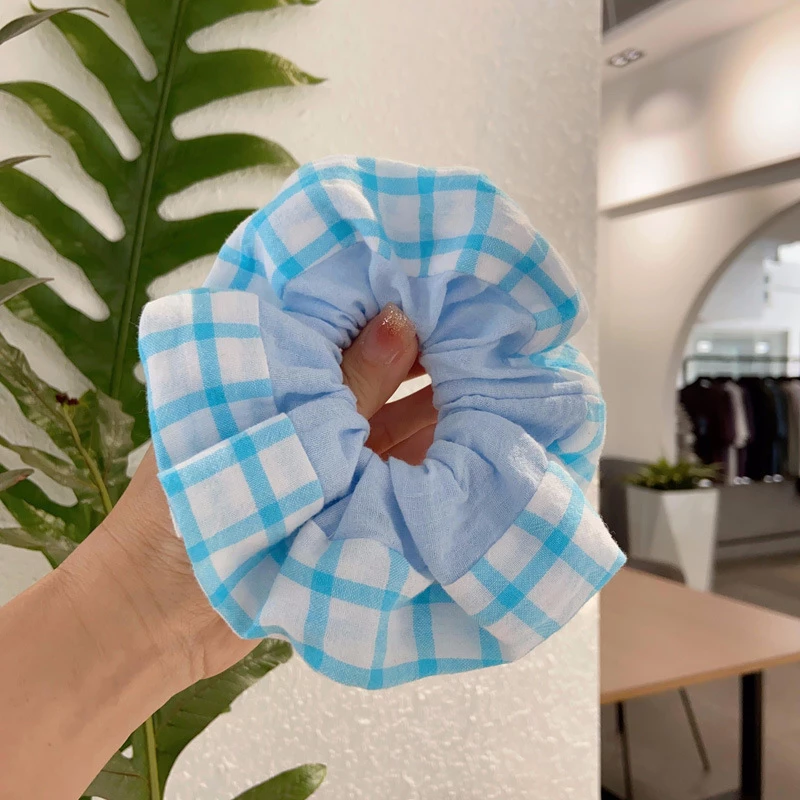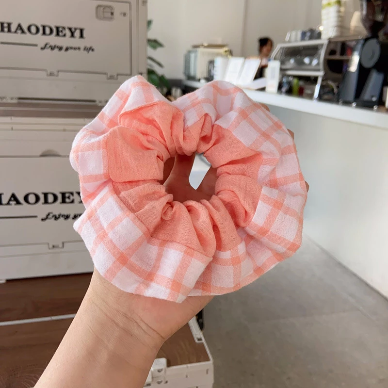 This is a women's fashion hair scrunchie, designed for daily wear and casual styling. It features an oversized, voluminous construction made from soft, breathable cotton-blend fabric in a fresh peach and white gingham print. The scrunchie provides a gentle yet secure hold for ponytails, buns, or half-up hairstyles, while its playful, preppy design adds a cheerful, youthful touch to any look.