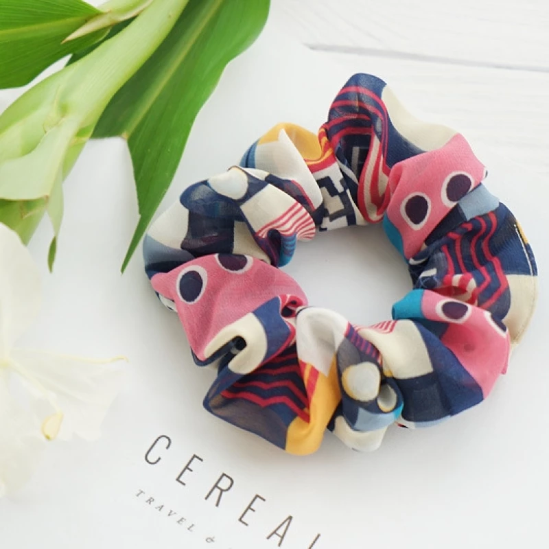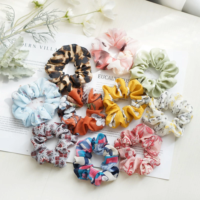 This is a set of fashion hair scrunchies designed for daily wear. Each scrunchie is made from a soft woven fabric with a unique print, including floral, plaid, and abstract patterns. They provide a gentle yet secure hold for ponytails, buns, or half-up hairstyles, while adding a decorative, casual touch to an outfit.