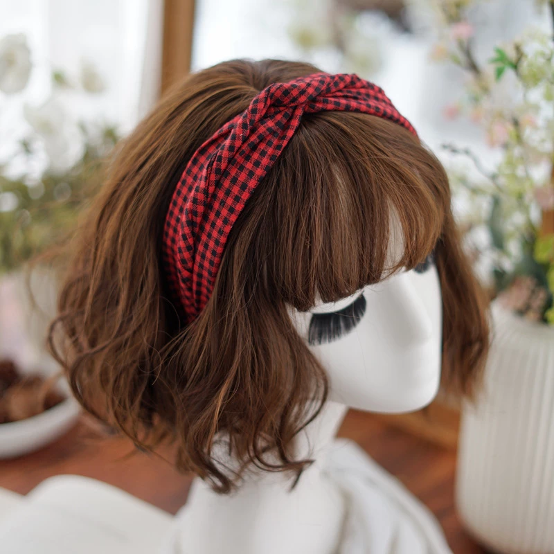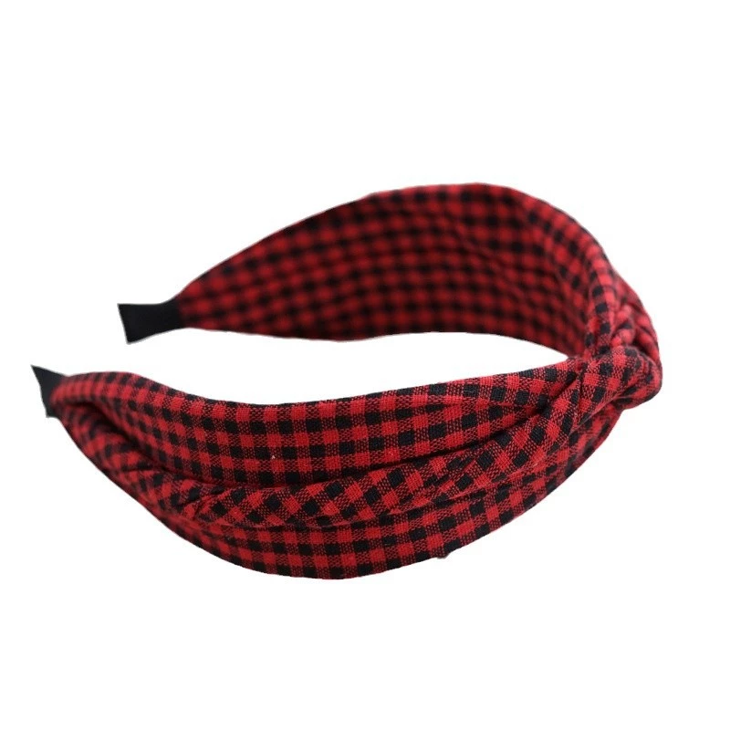 This is a fashion hair accessory. It features a wide, padded plastic headband base covered in a classic red and black gingham fabric, finished with a knotted detail at the top. The inner side has a non-slip grip to keep it securely in place, and the bold, retro-inspired design adds a fresh, playful touch to any hairstyle.