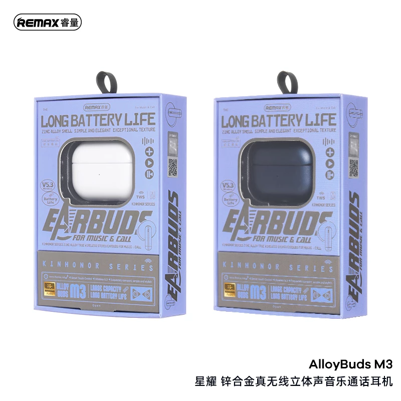 The REMAX AlloyBuds M3 is a stylish true wireless earbud set crafted from durable zinc alloy, combining modern design with practical functionality. Its sleek, polished finish offers a refined look, while the ergonomic in-ear shape ensures a comfortable, secure fit for daily use.