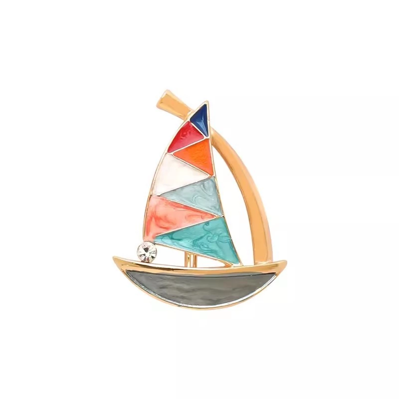 Materials: Gold-colored alloy base, decorated with multicolor artificial enamel (sail: blue/red/orange/white; hull: gray) and a cubic zirconia (artificial decorative stone) (hull accent); designed in a vibrant sailboat silhouette (symbolizing freedom and adventure).