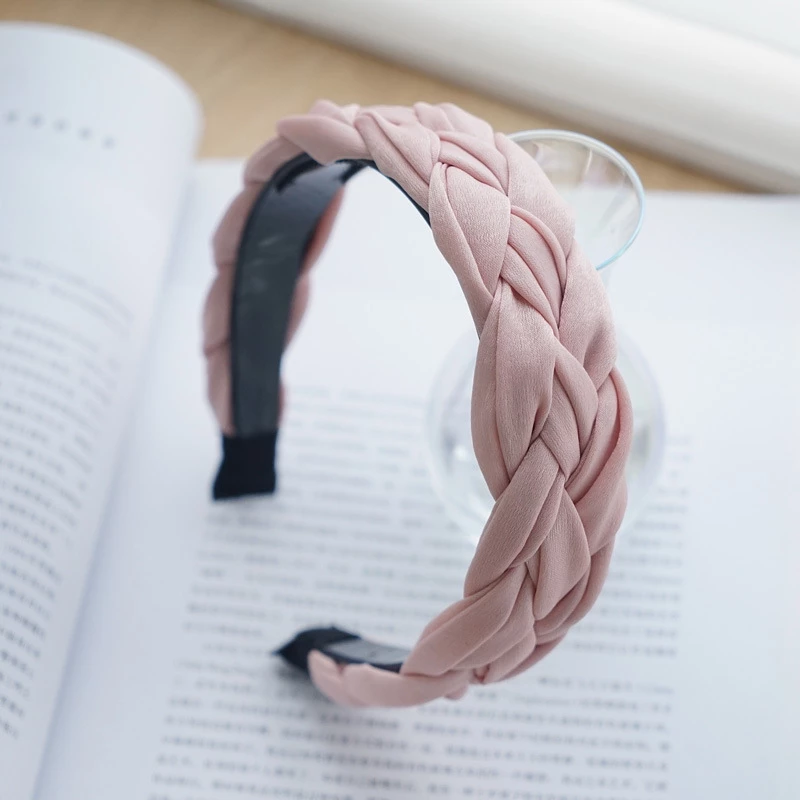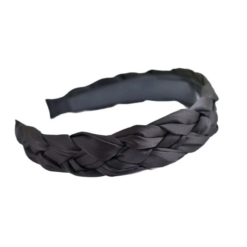 This is a fashion hair accessory. It features a wide, padded plastic headband base covered in a smooth, glossy satin fabric that is intricately braided for a textured, three-dimensional look. The inner side of the headband has a non-slip lining to help keep it in place, providing a comfortable and secure fit for everyday wear.