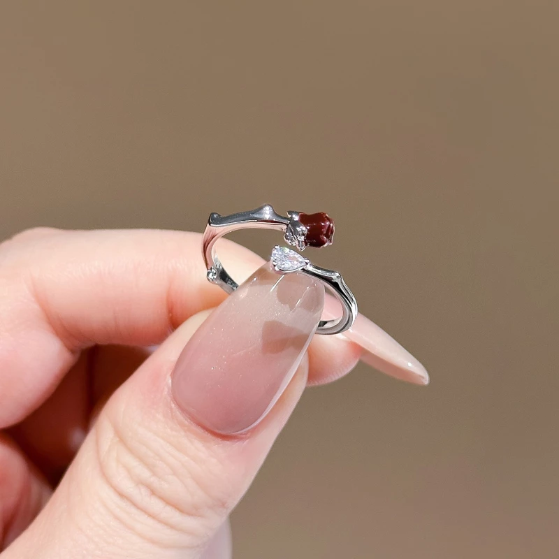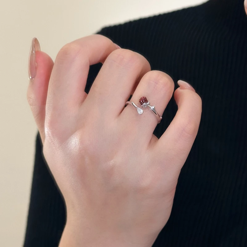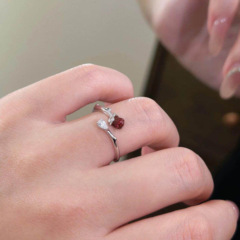 This open ring is crafted from durable silver-tone alloy, featuring a double-band design: one band holds a vibrant red artificial gem (with a glossy finish), and the other accents with a small cubic zirconia. The sleek silver-tone base complements the contrast between the rich red detail and sparkling zirconia, creating a refined, eye-catching look ideal for daily wear, dinners, or casual gatherings.