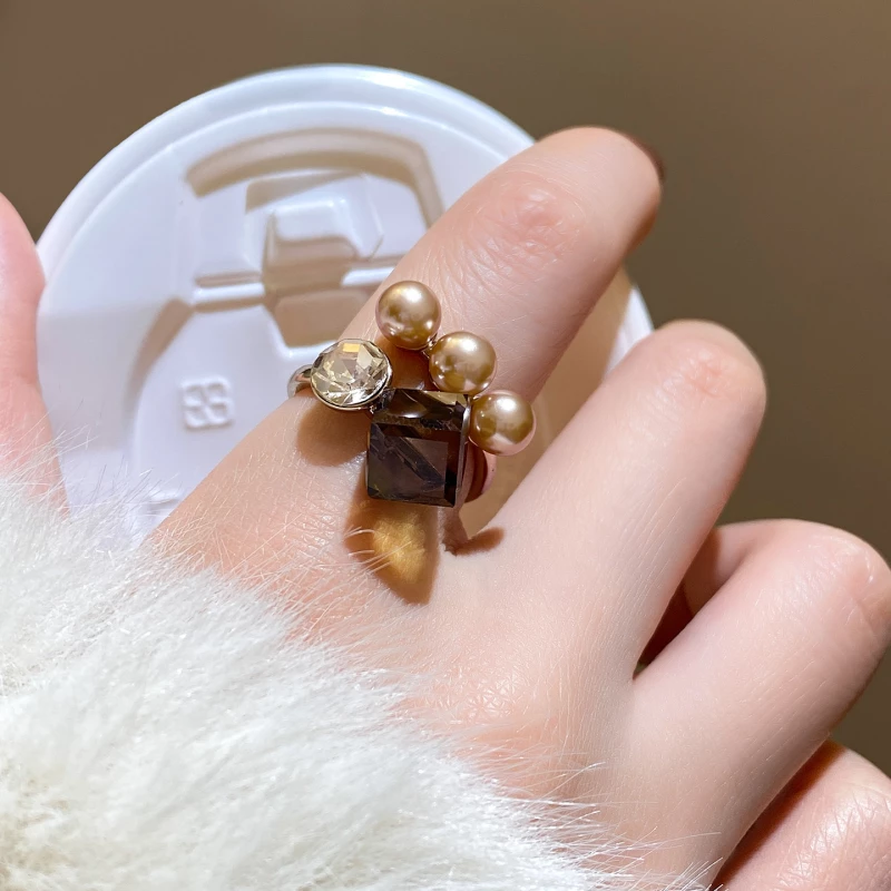 This striking statement ring features a layered design, crafted from durable silver-tone alloy for a polished, modern finish. It combines smooth faux pearls (in warm tones) with multi-shape artificial crystals (clear and smoky hues)—creating a bold, textured look that elevates both casual and statement-making attire.