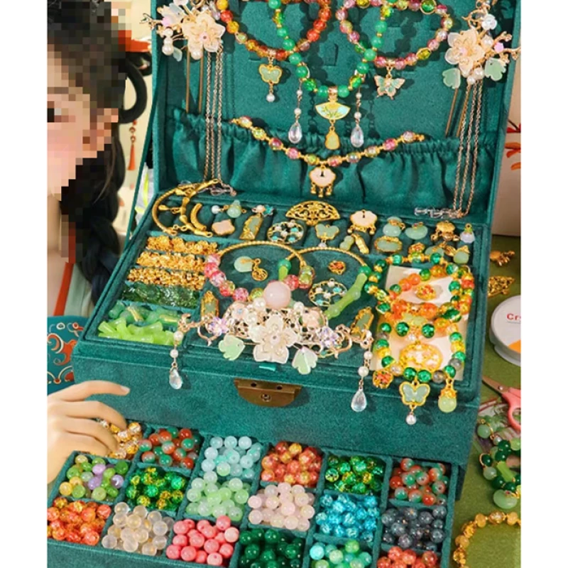 Create elegant, traditional-inspired accessories with this comprehensive DIY set, housed in a velvet storage case. The collection includes alloy (gold-toned) components, decorative beads (simulated gem-like textures), and hair ornaments—all designed in soft, earthy hues to evoke classic aesthetic charm.