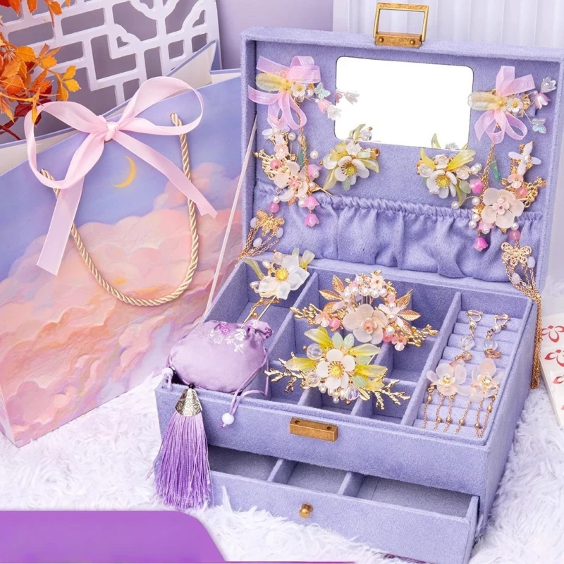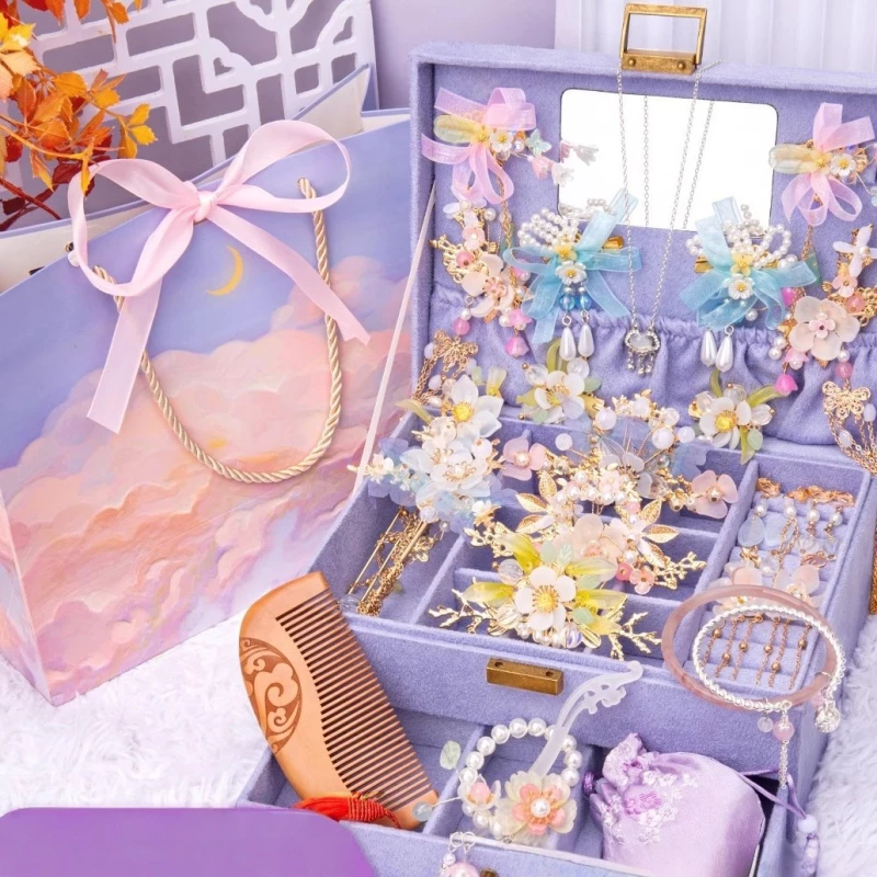 This comprehensive set includes a variety of traditional-inspired accessories (hairpins, hair clips, necklaces, bracelets) paired with a decorative storage case, featuring floral motifs and soft pastel color schemes. Crafted from alloy (with gold-toned plating), artificial pearls, and decorative resin accents (no precious metals or natural gemstones), the pieces are designed for matching traditional-style outfits, cultural events, or decorative styling. The storage case keeps accessories organized, while the lightweight, detailed designs offer both aesthetic appeal and comfortable wear.
