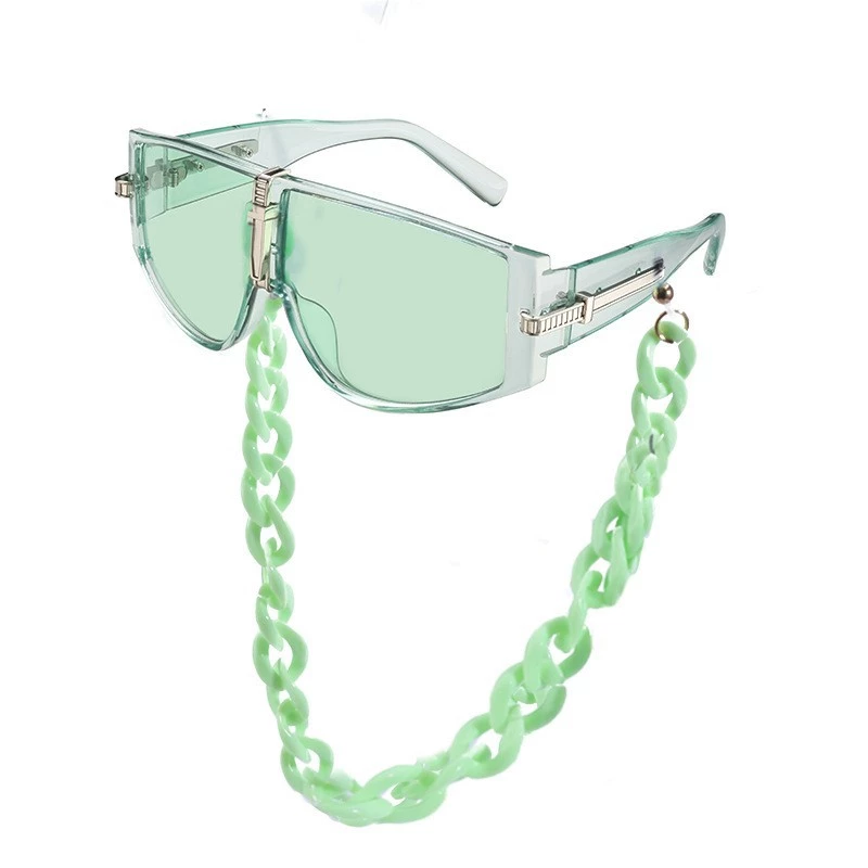 This product is a fashion accessory designed for daily wear and eye protection. The frame and chain are made of acetate with metal alloy accents, and it does not contain real gold, precious metals, or natural gemstones.