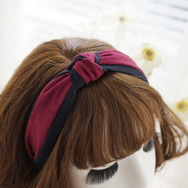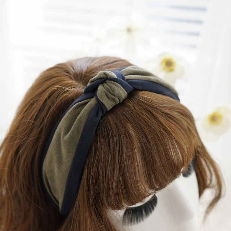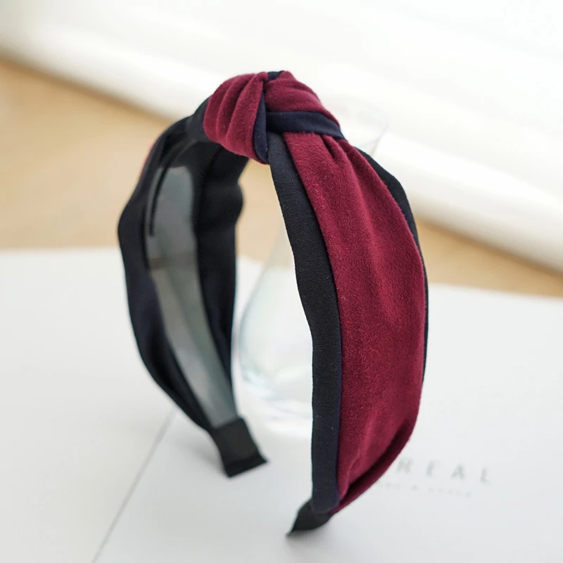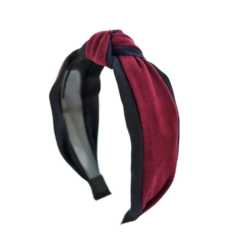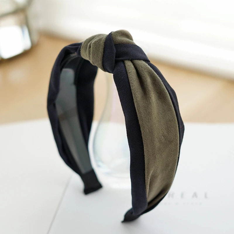 This is a fashion hair accessory. It features a wide, padded plastic headband base covered in a two-tone fabric with a contrasting knotted detail at the top. The inner side of the headband has a non-slip lining to help keep it in place, providing a comfortable and secure fit for everyday wear.