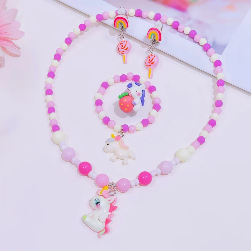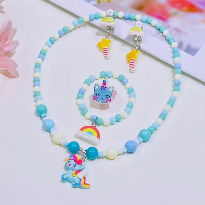 This 4-piece kids' jewelry set includes a beaded necklace, a matching bracelet, and two hair clips, featuring cute unicorn, rainbow, and star motifs in soft pastel tones (light blue, white, yellow). Crafted from resin beads, decorative alloy charms, and plastic accents (no precious metals or natural gemstones), the pieces are lightweight and designed for comfortable daily wear or special occasions like parties. The beaded design is gentle on skin, and the secure hair clip structure ensures easy use for children.