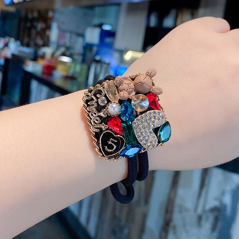 Elevate everyday styling with this 2-piece hair scrunchie set, featuring gold-toned alloy frames adorned with synthetic crystal accents, resin bunny motifs, and "Sweet" lettering. The vibrant gem-like details (in purple/clear and red/green palettes) pair with soft black elastic bands, making these scrunchies ideal for casual wear or adding a playful touch to any hairstyle.