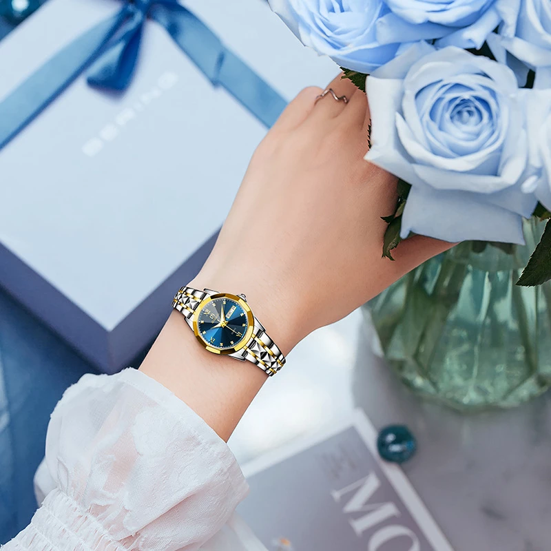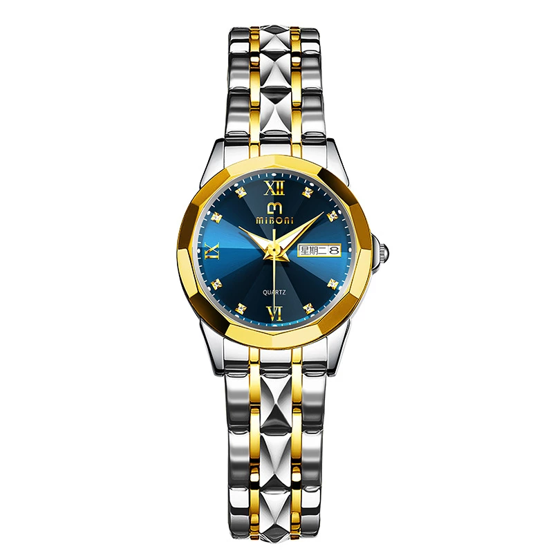 This is a fashion watch designed for women, featuring a two-tone (silver and gold) alloy case and bracelet-style band. The deep blue dial has a radial pattern and luminous hour markers, creating a polished, versatile look suitable for daily casual and semi-formal wear.