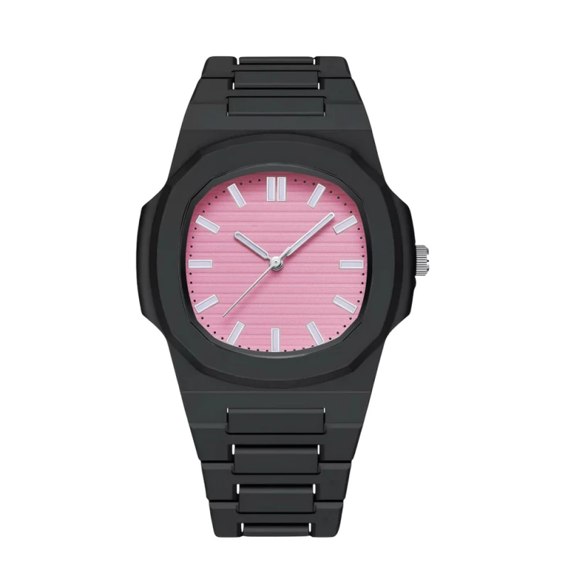 - Dial: Pink with horizontal stripe pattern and white hour markers