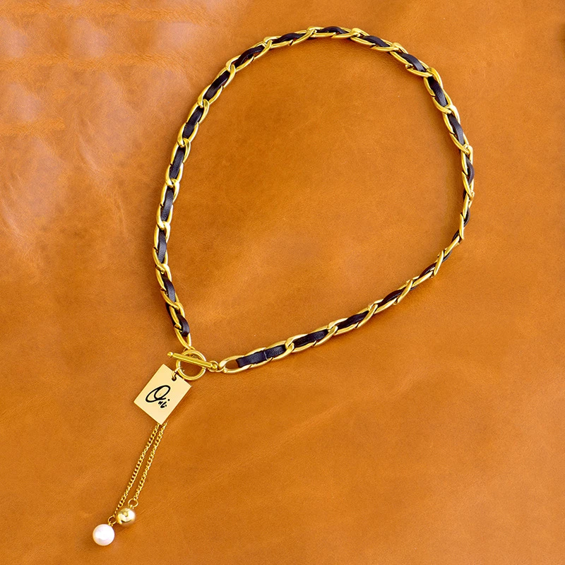 Elevate your edgy-chic style with this mixed-material choker: crafted from gold-tone alloy links paired with black faux leather accents, plus a personalized initial tag and a tassel with a faux pearl + alloy ball. The adjustable, close-fitting design blends modern edge with subtle charm—ideal for blazers, dresses, or casual outfits.