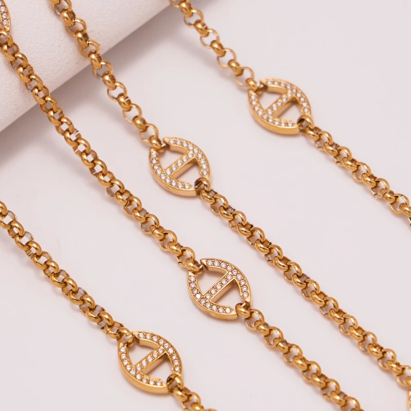 Elevate your layered styling with this elegant long necklace, crafted from durable stainless steel with a sleek gold-tone finish. It features a fine chain interspersed with mariner-style links, each embedded with sparkling cubic zirconia stones for subtle, eye-catching shimmer.
