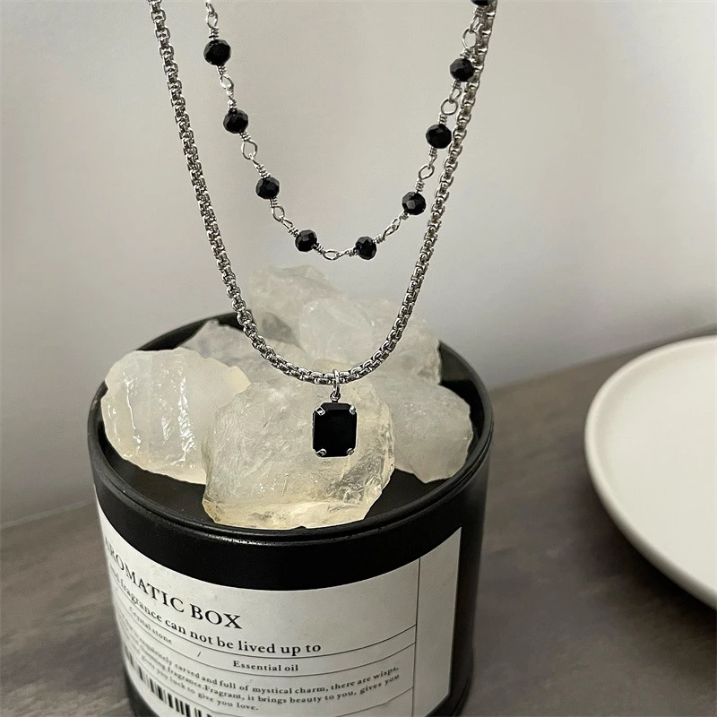 Elevate your edgy style with this two-tone layered necklace: crafted from silver-tone & red-tone alloy chains, paired with black/red artificial decorative beads and a square artificial gem pendant. The adjustable-length design blends bold contrast with subtle shine—ideal for casual outfits, streetwear, or statement accessory looks.
